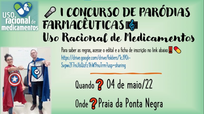 Estão abertas até o dia 30 de abril as inscrições para participar do I Concurso de Paródias Farmacêuticas, que faz parte da programação do I Simpósio de Assistência Farmacêutico do Amazonas. A ação é voltada para alunos dos cursos de graduação em Farmácia das Faculdades do Amazonas. O edital pode ser conferido em: https://bit.ly/3v5HDiP