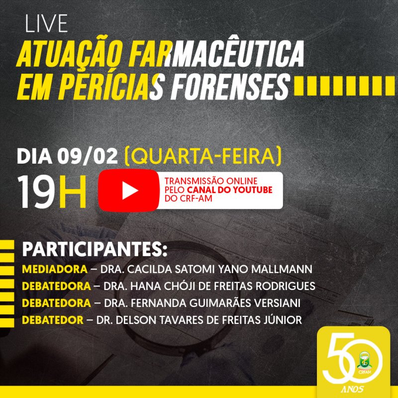 O CRF/AM promove na próxima quarta-feira, 09/02, uma live sobre Perícia Forenses, com a participação de especialistas sobre o assunto. O evento ocorre a partir das 19h, no canal do YouTube do Regional.